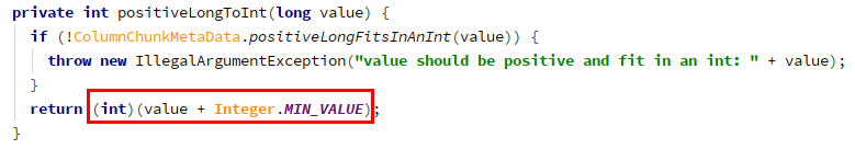 - 使用时,再转回来,IntColumnChunkMetaData.getValueCount -> intToPositiveLong():