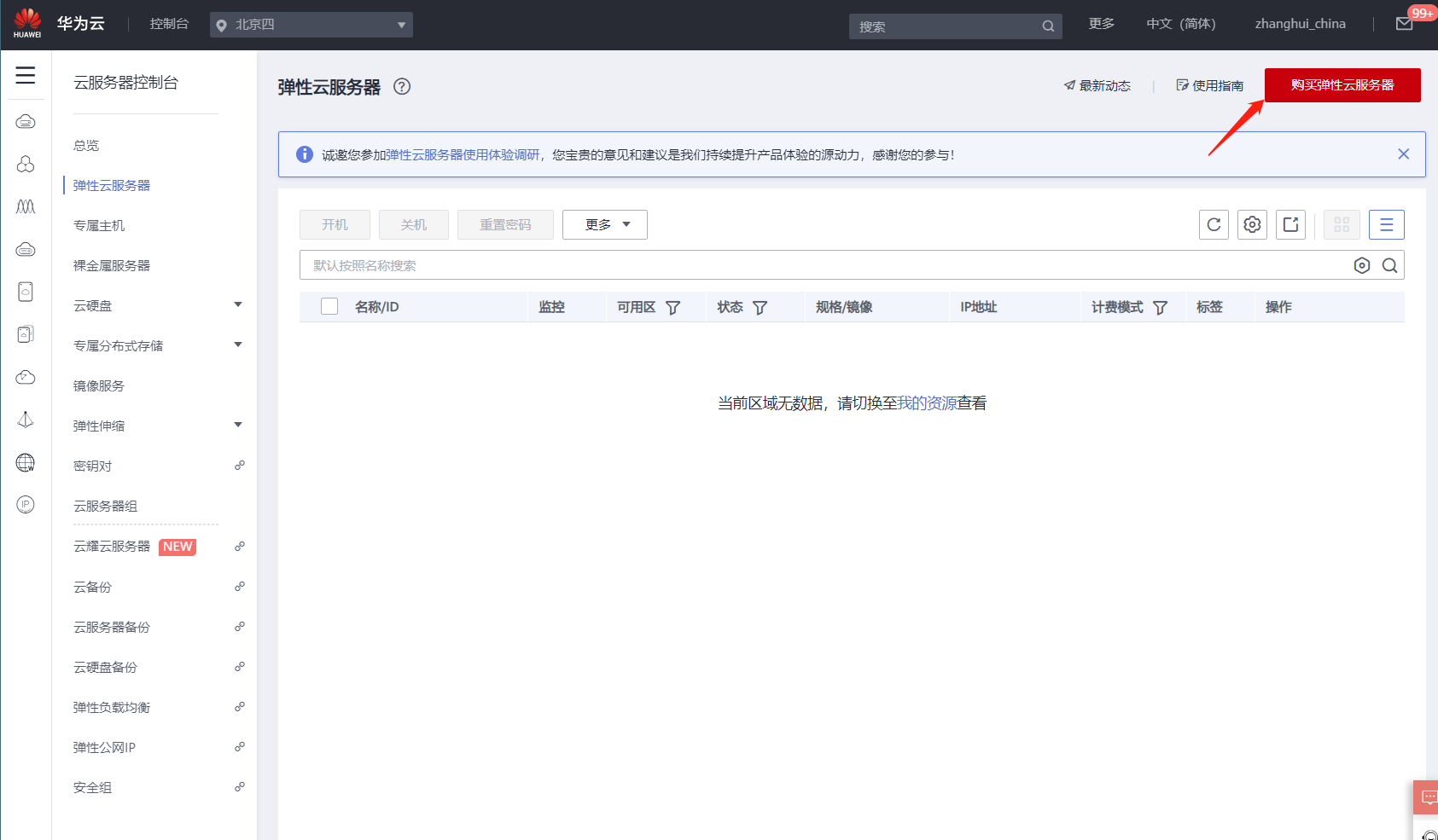 在 https://console.huaweicloud.cn/console/?locale=zh-cn®ion=cn-north-4#/home 控制台,选择 服务列表-计算-弹性云服务器ECS