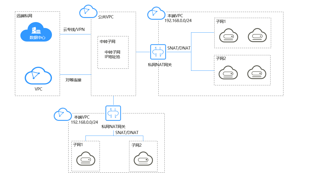 中转子网——私网NAT网关服务中的中转网络。您可以在中转子网中创建私网IP,即中转IP,使本端VPC中的云主机可以共享该私网IP访问用户IDC或同Region远端VPC。