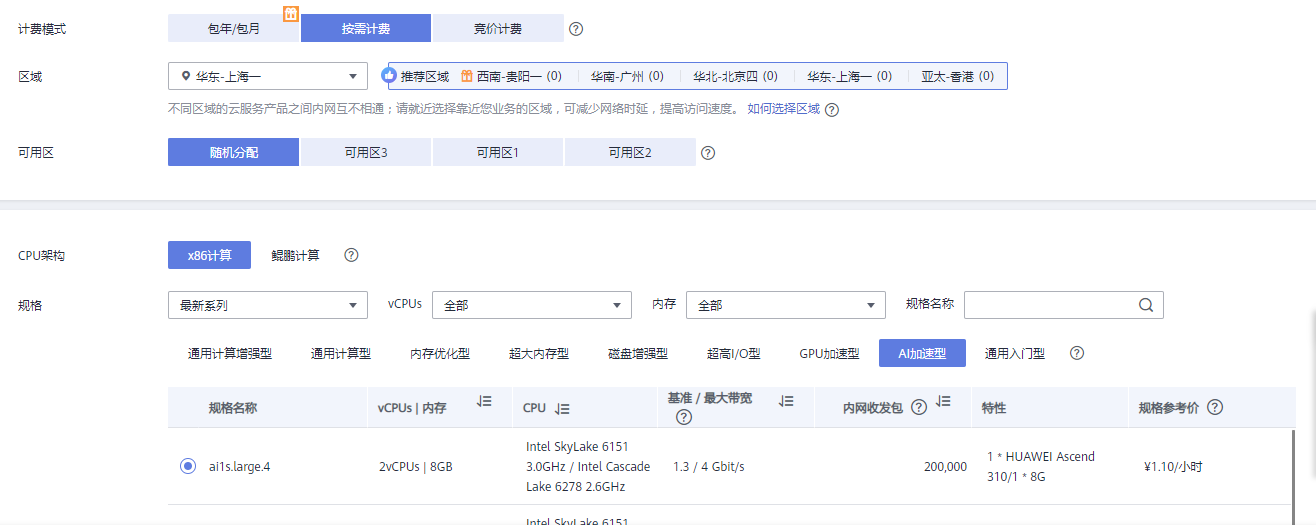 计费方式选择按需计费,CPU架构选择:鲲鹏计算,资源选择:ai1s.large.4,操作系统选择Ubuntu 18,硬盘40GB应该是足够了。选择流量的位置,建议选择按流量计费,这样带宽无论选择多少,价格都差不多。