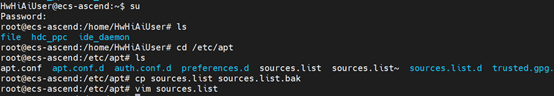 切换到root用户,到/etc./apt目录下,对source.list文件进行修改,修改前记得备份