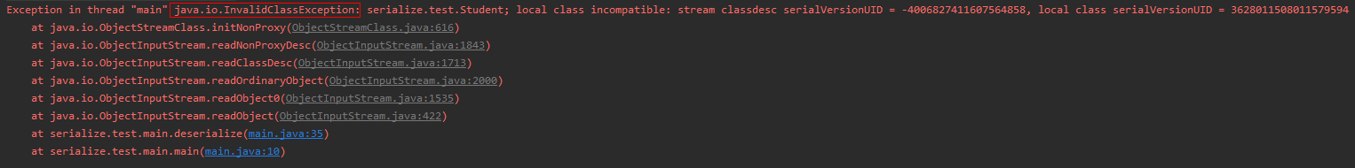 这时候,我们拿刚才已经序列化到本地的student.txt文件,还用如下代码进行反序列化,试图还原出刚才那个Student对象: