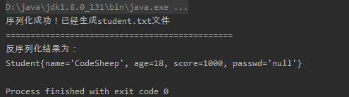 这样在序列化Student类对象时,password字段会设置为默认值null,这一点可以从反序列化所得到的结果来看出:
