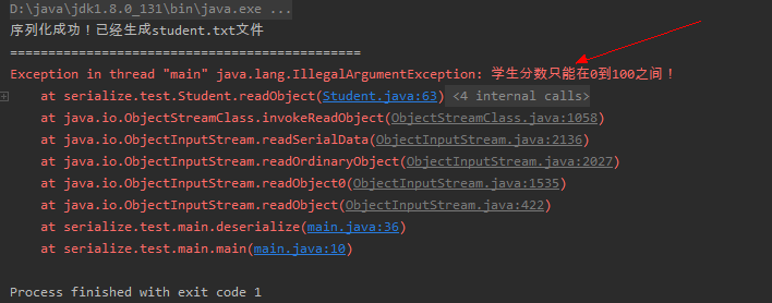 比如我故意将学生的分数改为101,此时反序列化立马终止并且报错: