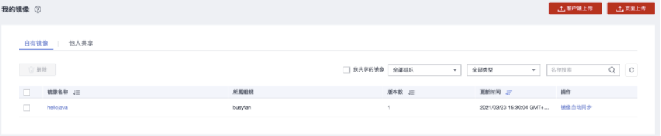 注意:上面的镜像,必须要加上swr.cn-east-2.myhuaweicloud.com/busyfan的tag标签,否则无法推送;
