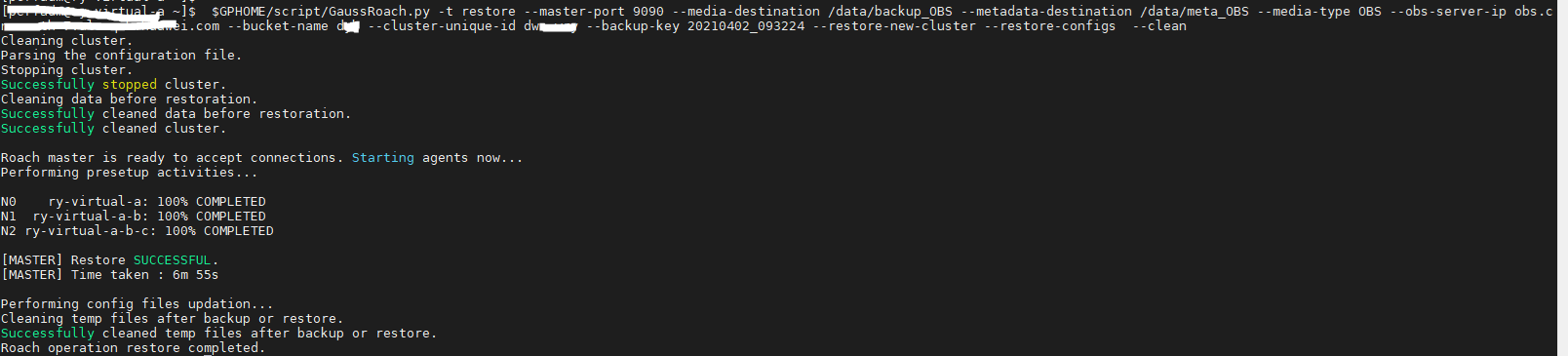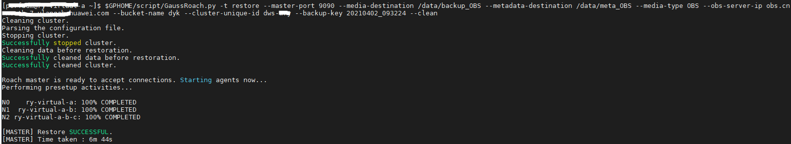 $GPHOME/script/GaussRoach.py -t restore --master-port 9090 --media-destination /data/backup --metadata-destination /data/meta --media-type OBS --obs-server-ip xxx.xxx.huawei.cn --bucket-name xxx --cluster-unique-id dws-xlnobs_xxx --backup-key 20210331_181321 --clean