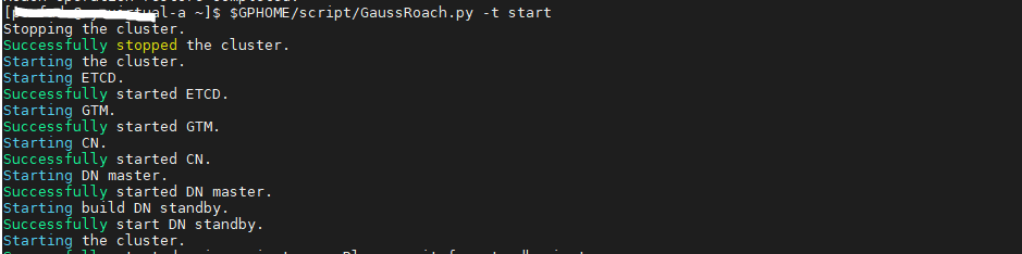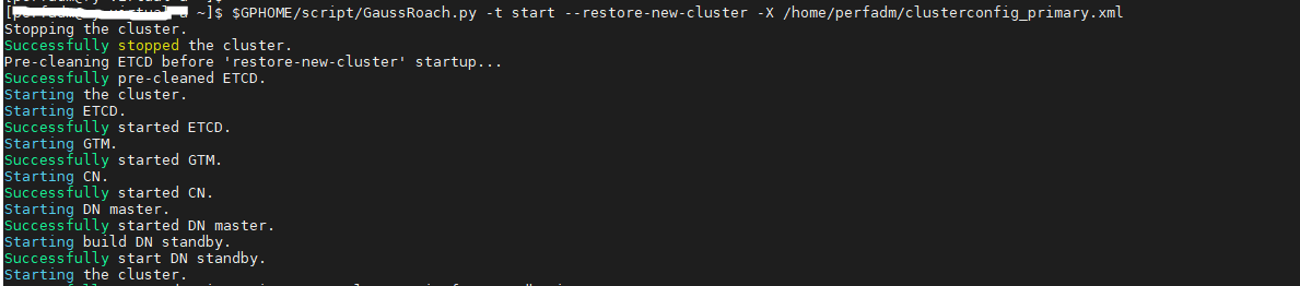 $GPHOME/script/GaussRoach.py -t start --restore-new-cluster -X /test/clusterconfig.xml