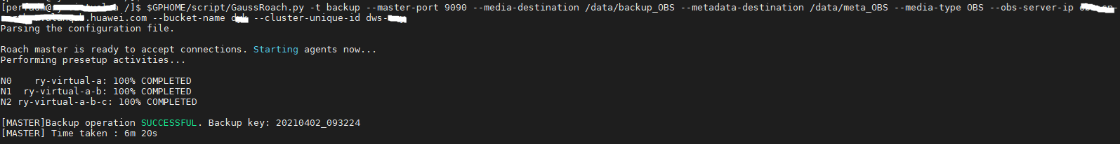 $GPHOME/script/GaussRoach.py -t backup --master-port 9090 --media-destination /data/backup --metadata-destination /data/meta --media-type OBS --obs-server-ip xxx.xxx.huawei.cn --bucket-name xxx --cluster-unique-id dws-xlnobs_xxx