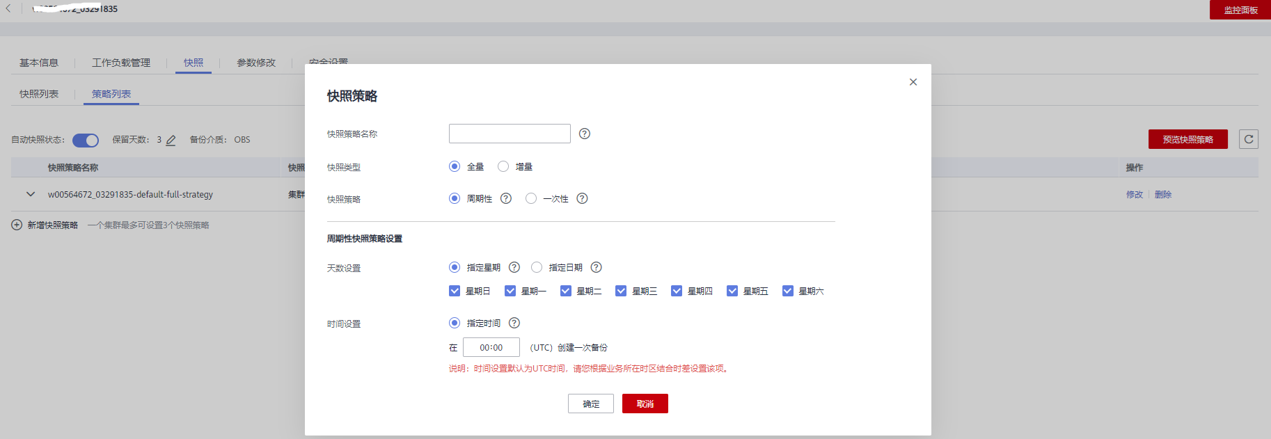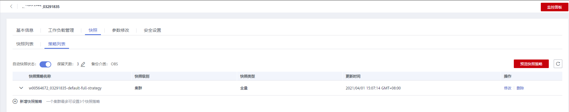 GaussDB(DWS)支持按照时间点、日期、星期制创建周期性、一次性的全量、增量或者(全量 + 增量组合)的快照策略,集群按照设置的策略进行备份: