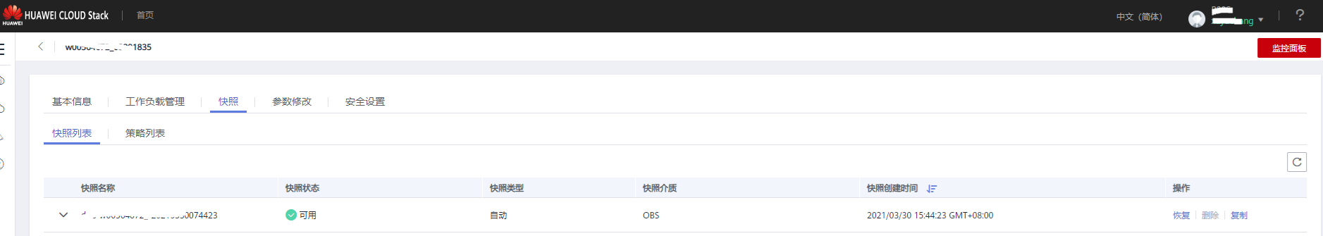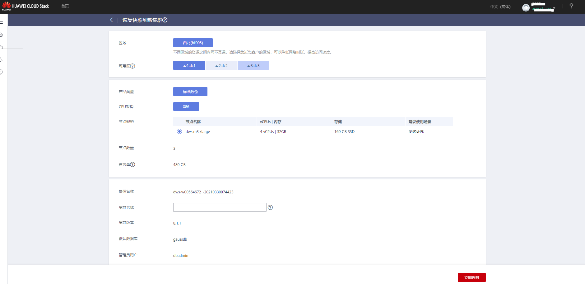 选中创建的快照 –> 点击恢复-> 创建集群后恢复到新集群: