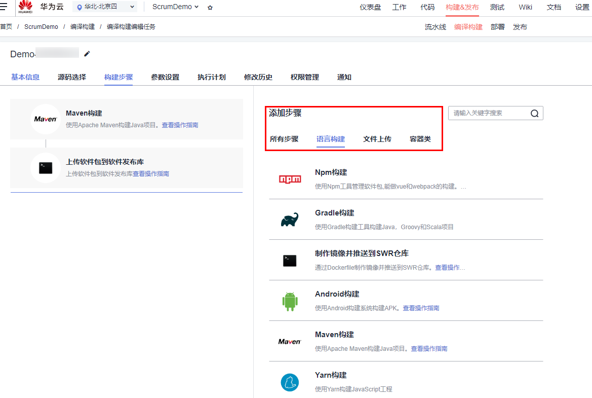 用户可根据自己的编程语言,编程环境,自主配置所需的构建步骤。