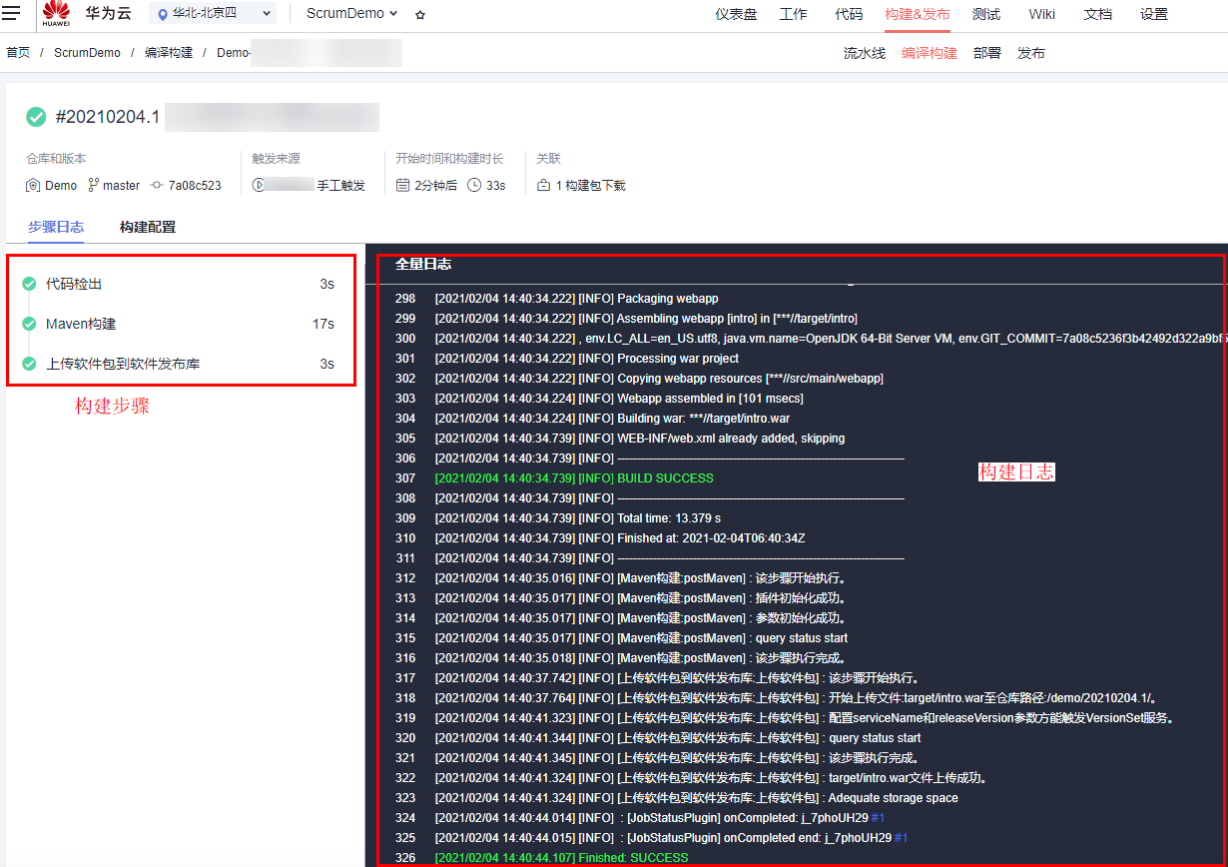 构建步骤配置完成,可执行该任务,对指定的代码仓库进行编译构建。