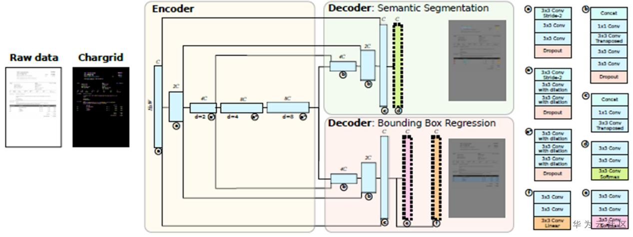 随后该向量表示作为chargrid-net的输入,基于encoder-decoder的CNN网络结构(如图3所示)进行关键信息的文本框检测和语义分割。整个网络由分割损失、边框分类和边框坐标回归三个部分组成的损失函数优化学习: 。关键信息内容通过将分割类别属于同一类别的字符整合得到。