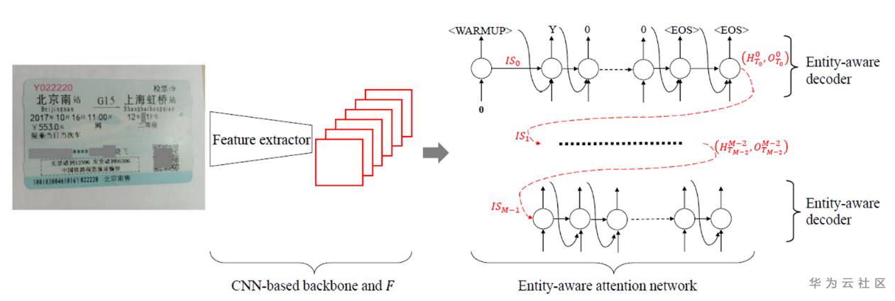 具体地,如图8的网络结构所示,EATAN采用CNN骨干网络来提取得到文档图片的高层视觉信息,然后利用实体类别感知的注意力网络来学习实体布局信息,最后利用基于LSTM的解码器解码得到预设的实体内容。该模型由于直接从图片中得到文档关键信息,易于加速优化,便于边缘部署。
