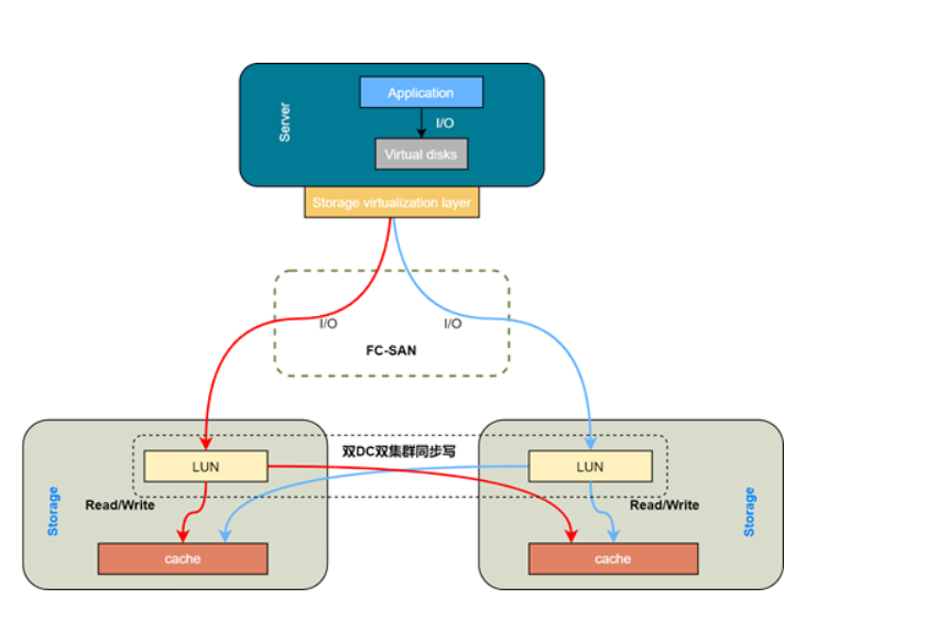 前面提到,此次双活云在存储层的设计目标是实时复制,与异步复制不同的地方在于,同步复制要求在两端数据都落盘(或写入缓存层)后,IO才算是成功。由此可能会带来IOPS性能问题,但链路层与网络层的性能与高可用支撑,可以最大化减轻此种方式带来的影响。