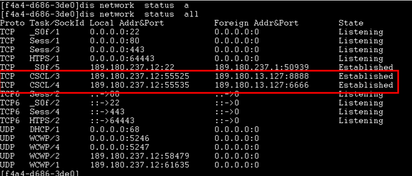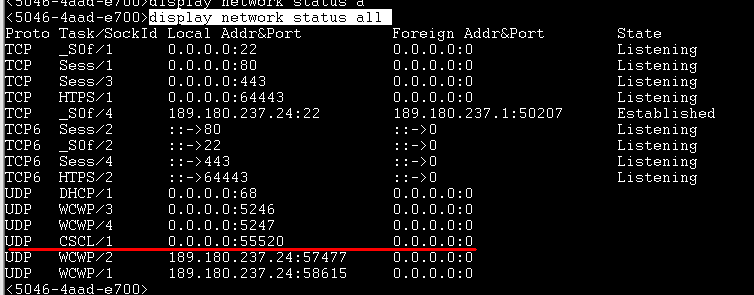 登陆AP,执行display network status all,查询CSCL进程,表示AP端口占用情况。如下是UDP协议通信情况