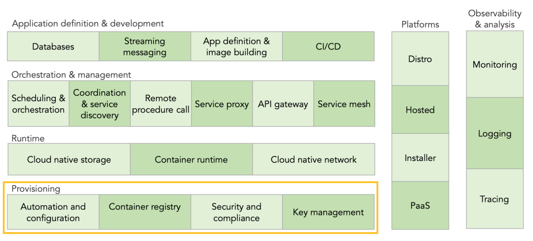 云原生环境中的第一层是供应层(Provisioning)。这涵盖了从自动化基础结构的创建,管理和配置镜像扫描,镜像签名和存储镜像的所有内容。该层还扩展了安全性,其工具可用于设置和实施安全策略,处理应用程序和平台中身份认证和授权,以及密钥分发。