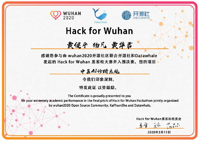 2020年3月,当时正发生疫情,无意间一位年长的朋友邀约我去参加武汉黑客松比赛。他本身是做医疗的,是一位中医师傅。疫情期间他也捐赠过许多,可能是在捐赠群里发的比赛消息,他看到后想去试试。他知道我是学软件的,而且对医疗这方面感兴趣,就叫上了我。举办方是开源社,是武汉黑客松比赛,主要是以程序的方式来帮助武汉。