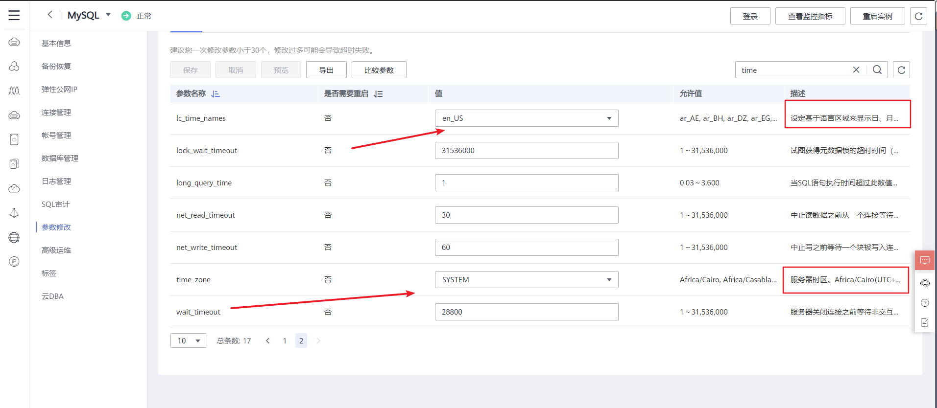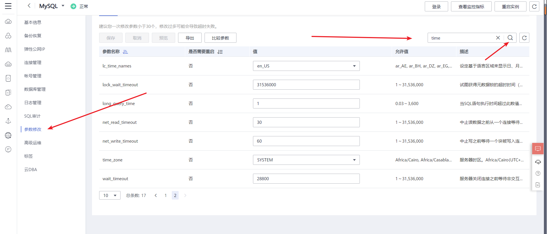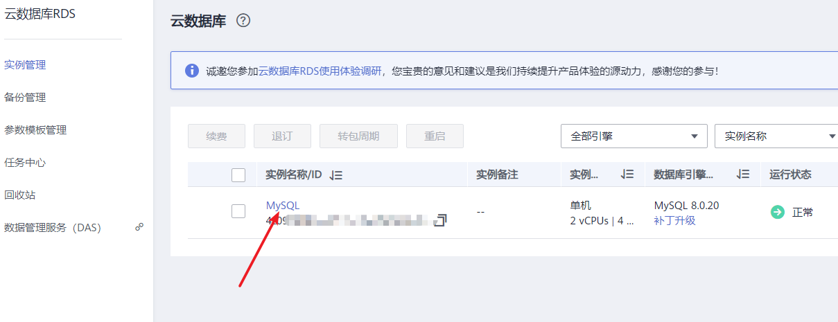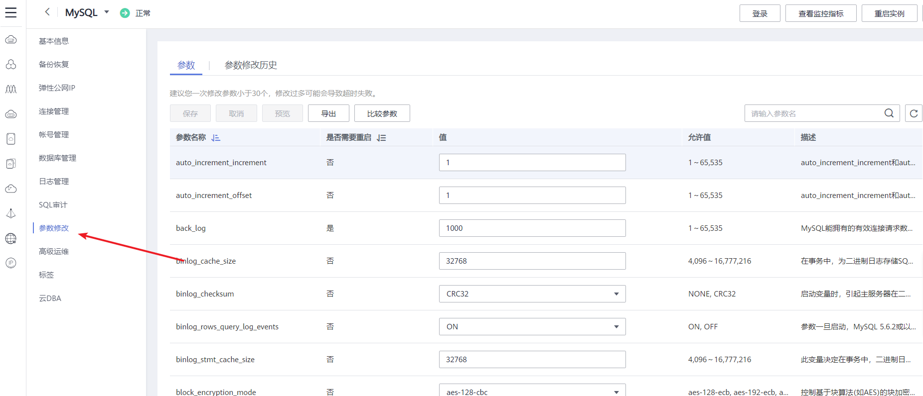 1、点击MySQL的实例名称,进入参数修改页面