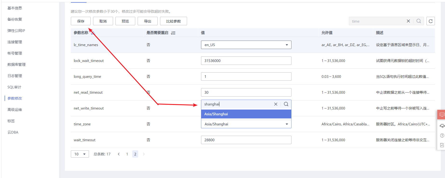 修改下MySQL 的服务器时区,改为中国上海的时区,在搜索中直接输入shanghai,记得最后要点击保存,然后修改的参数就会立即生效了