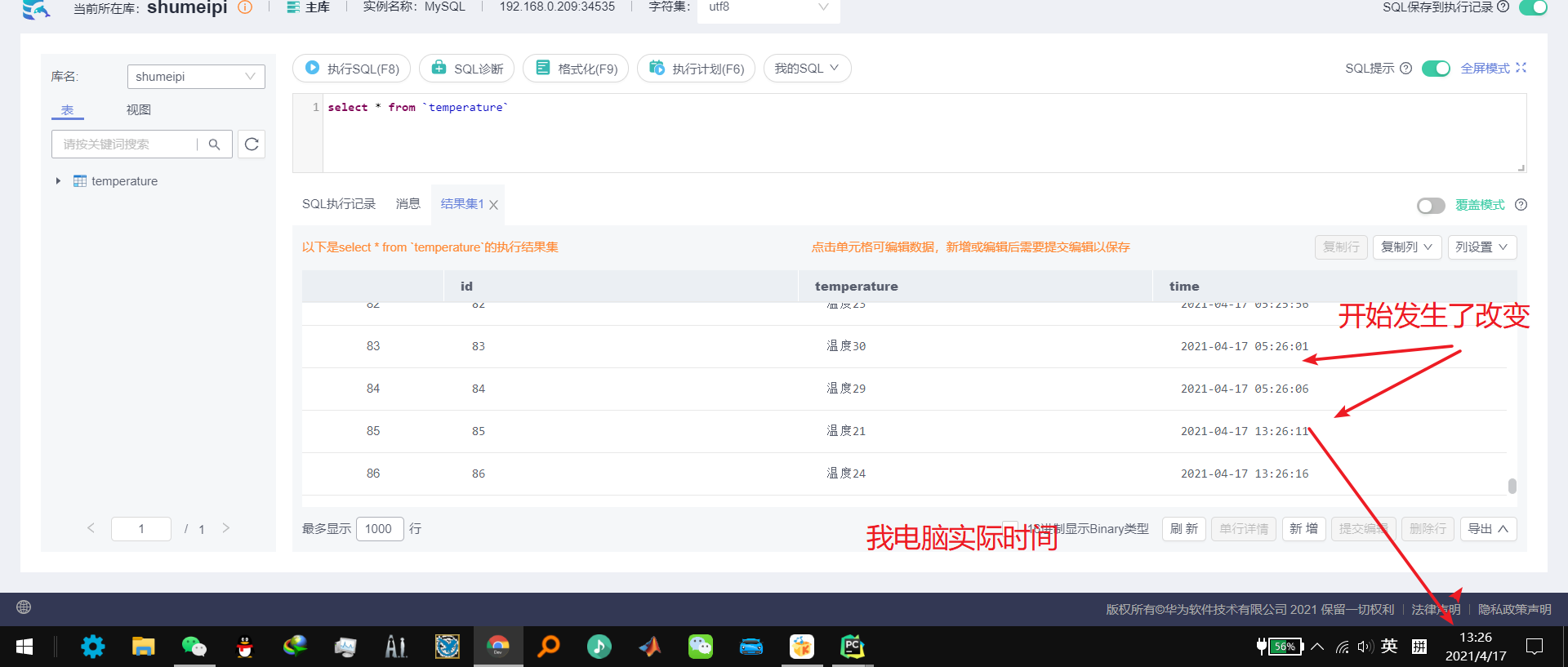 去年就买了个华为云上面的MySQL,可一直放在一旁吃灰,由于这学期的课程任务,我负责搭建一个小型云平台,实现一个数据上传功能,需要用到了数据库,可我在使用MySQL时发现,我上传保存数据的时间不是我当前实际的时间。