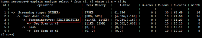 在分布表关联分布时,分布列不同时,存在Streaming(type: BROADCAST)广播,不同DN节点之间数据存在交互,会增加网络开销,而分布列相同或关联复制表数据时,不存在DN节点间数据交互。下面我们进行下实际测试: