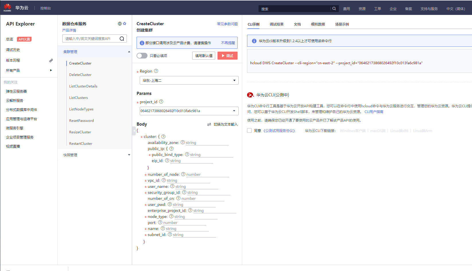 以下为进入后的DWS的API Explorer页面,其中左侧第二栏为数据仓库服务的Open API接口,左侧第三栏为接口调用参数输入和接口的调试,最右侧包含了CLI示例、调试结果、文档、模拟数据、场景示例页签,功能分别为:
