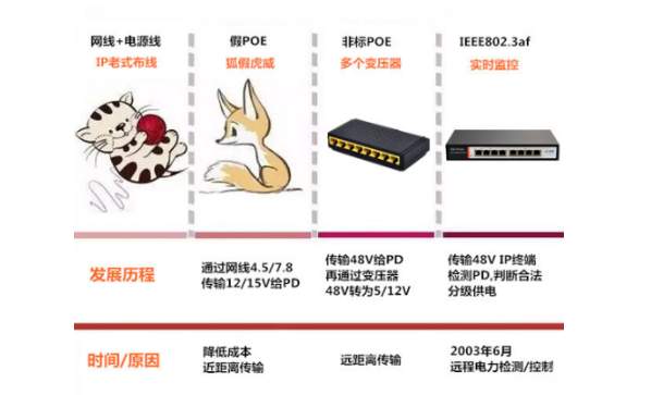 PoE交换机,其实就是一部安防电源的进化史,它大致可以分为五个阶段:网线+电源线、假PoE、非标PoE、IEEE802.3af标准、IEEE802.3at标准。