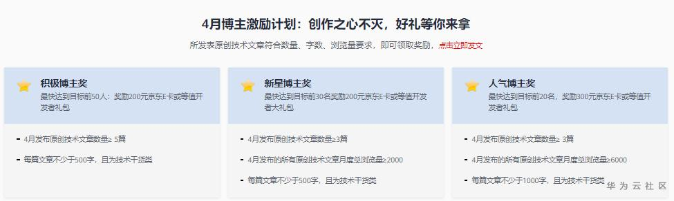 【摘要】 创作之心,永不停止为了建造积极健康的创作氛围帮助更多的原创博主不断成长4月博主激励计划重磅开启!激励计划旨在奖励在华为云社区博客积极发文和发表优质博文的博主!和之前的TOP10奖励不同,这次火炬手给大家争取到了更多的名额!按照发文的数量和质量设置了三等奖励。名额总计100个!4月发表5篇以上原创文章即有200元奖励不管你是技术萌新,还是大咖,都可以通过用心创作,积极发文,积极分享来冲击奖项!...