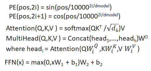 - 将输入单词用word2vector转化成嵌入向量,加上PE位置特征;PE为位置特征,因为transformer将单词直接enbedding后,并没有包含单词的位置信息,因此强迫加入PE,每个单词的位置特征,位置使用三角函数,是由于一个单词不仅和它的绝对位置有关,而且和它的相对位置有关,而三角函数恰巧可以表示相对信息,一个位置可以由其它任意位置表示,公式中dmodel为word_to_vector的维度,i为word_to_vector中的遍历,pos为单词在句子中的位置,这样word_to_vector中每一个值就可以表示不同频率下的位置表示。