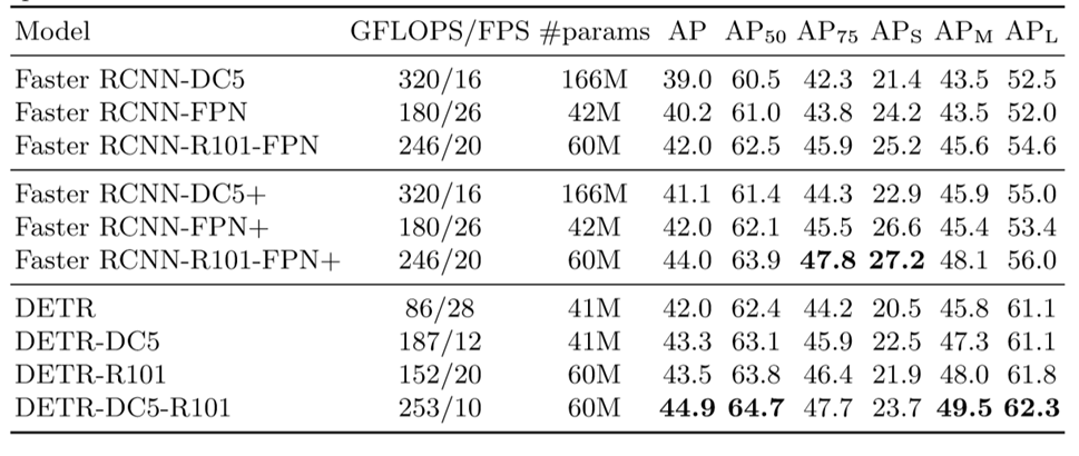 图九为整个模型的结果对比,基本上在相同的FPS下,transformer由于普通的RCNN,但是我在这里严重怀疑作者肯定没有在Faster上加各种trick,加了trick在coco上应该不止这个点吧。就是欺负人,不过话说回来,transformer新出来就只能先和常规的RCNN较量一下,后续发展,装备起来了就能和加了各种trick的Faster较量较量了。