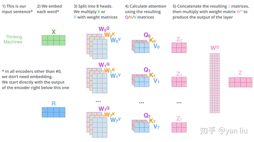 - 相加之后得到最终的输出结果z。如图二,由于是multi_head,作者在这里使用了h个head。这里可以理解为将特征分散到h个子空间进行特征学习。
