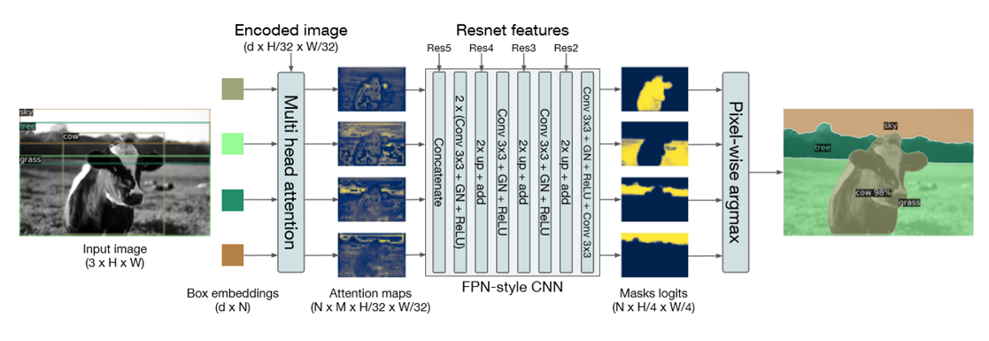 pipeline介绍:首先输入一张图片,过CNN得到feature map,然后加上feature channel维度的位置特征,组成一个序列,当成transformer encoder的输入,decoder的输入是随机初始化的N个向量,初始化好后就通过网络进行学习改变,N为网络要预测一个图片中框的个数,一般比图片中物体的个数大的多,可以理解这N个随机初始化的向量为N个人训练这N个人对这张图片中哪里比较关注,如图七,左上角第一张图表示第一个随机向量训练好后reshape然后激活后的热点图,可以看到,第一个人比较关注一张图片中左下角的信息,也就是说,人力来一张图片,他会对这张图片提问,“hi,你的左下角有哪些东西”。然后从decoder输出N个特征向量,通过全连接层FFN输出N个框和框对应的类别,最后通过基于全局的损失函数进行优化。下面详细介绍一下基于全局的损失函数。