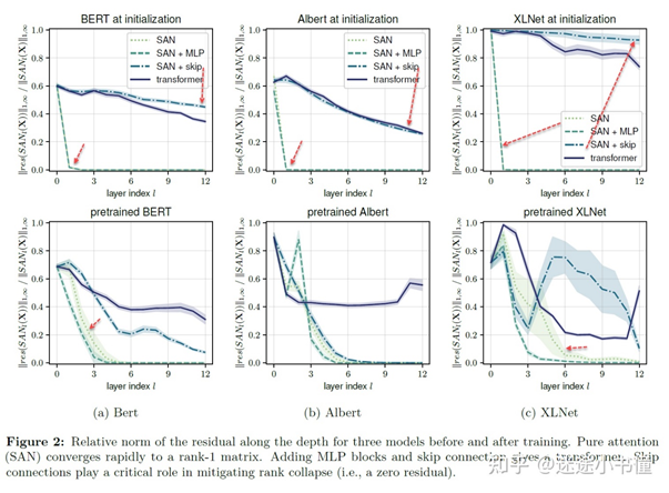 - 特别的,如果没有skip connection (residual connection-残差链接)和MLP(h->4h->h的双层position-wise feed-forward network)罩着,自注意力网络的输出会朝着一个rank-1的矩阵倍速+指数级收缩;即,skip connection和MLP可以很好地阻止自注意力网络的这种”退化“;