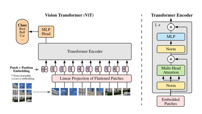 pipeline介绍:论文的题目是一张图片顶16个单词,transformer在大规模图像识别分类任务中的应用。这里图片将一张图片切割成9个patch,每个patch其实就是一个单词,然后对每一个patch过一个全连接层得到它的特征,在和它的位置特征信息进行相加,最后作为一个序列送入到transformer的encoder中。最后再通过一个全连接层输出分类的置信度。