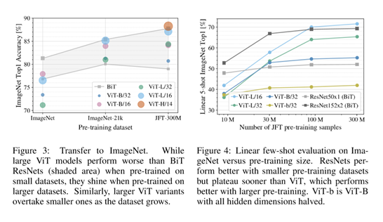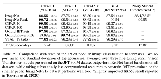 - ViT训练的更快,一个TPU只有2.5k天,resnet要9.9k天,此处必须要膜拜一下谷歌的机器真的真的多,同时参数更少