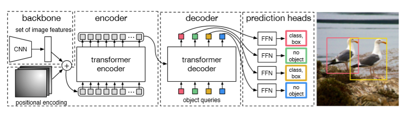 - 整个DETR架构包括两部分:基于集合的全局损失与Transfomer encoder-decoder。