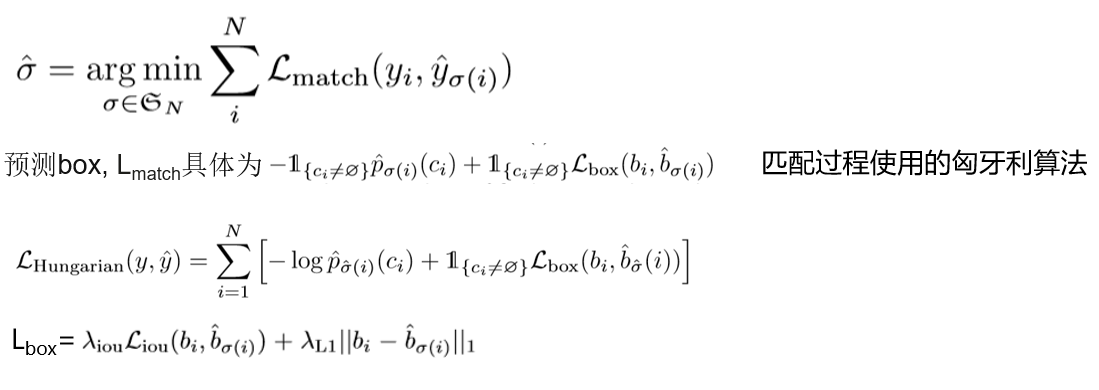 首先你预测出来N个框以后,但是GT一般远小于N,一般的检测框架是先通过NMS消框,然后通过IOU匹配,最后在算loss,而本文提出的loss的流程为先将GT扩充到N个,扩充的时候类别用背景类进行扩充,bbox就无所谓,因为如果是背景框的话就不进行框的loss计算。扩充完后就变成了二分图最优匹配问题,所以使用匈牙利算法,按照IOU和类别进行匹配,最终得到每个预测框对应的gt,然后分类使用softmax进行匹配,回归使用iou loss和L1的加权进行计算来优化整个网络。图八中第一行为整个loss函数,第二行为匹配函数,第三行为匹配好后的损失函数,分别为类别和框的损失函数,第四行为box的损失函数。