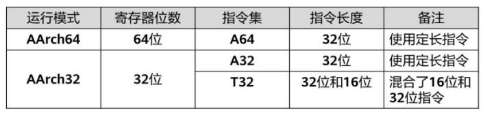 在本模式下,所有地址保存在32位寄存器中,基本指令集可以使用32位寄存器来处理。AArch32状态下的指令集可分为A32和T32。