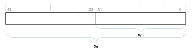 Wn寄存器对应Xn寄存器的低位