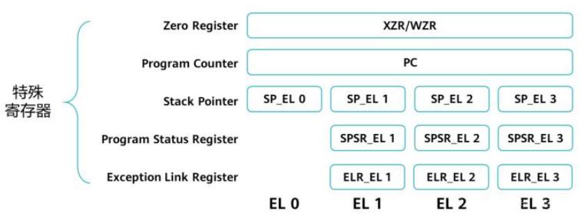 (1)不同的安全模式共用零寄存器和计数器寄存器,堆指针只有ELo模式下,其他寄存器每种模式都各自的。