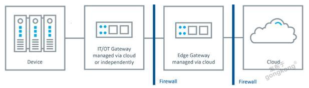 (在典型的物联网应用拓扑中,两个网关层包括自动化网络中的一个网关层,以及两个防火墙之间的“隔离区”中的第二个网关层。)
