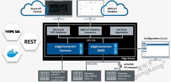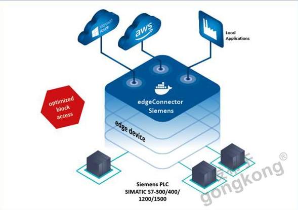 edgeConnector Siemens使您能够访问SIMATIC S7-1200和S7-1500数据,包括优化的数据块。V1.20版本还支持SIMATIC S7-300/400控制器。客户端应用程序可以通过互操作性标准OPC UA访问数据。可以通过内置的Web接口在本地配置产品,也可以通过REST接口远程配置产品。它可以与Azure IoT Edge和AWS IoT Greengrass无缝集成,也可以通过Docker Hub等在线存储库使用。
