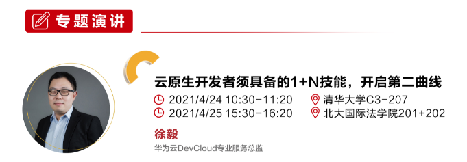 4月24日至4月25日,将由华为云DevCloud专业服务总监 徐毅为大家带来《云原生开发者须具备的1+N技能,开启第二曲线》