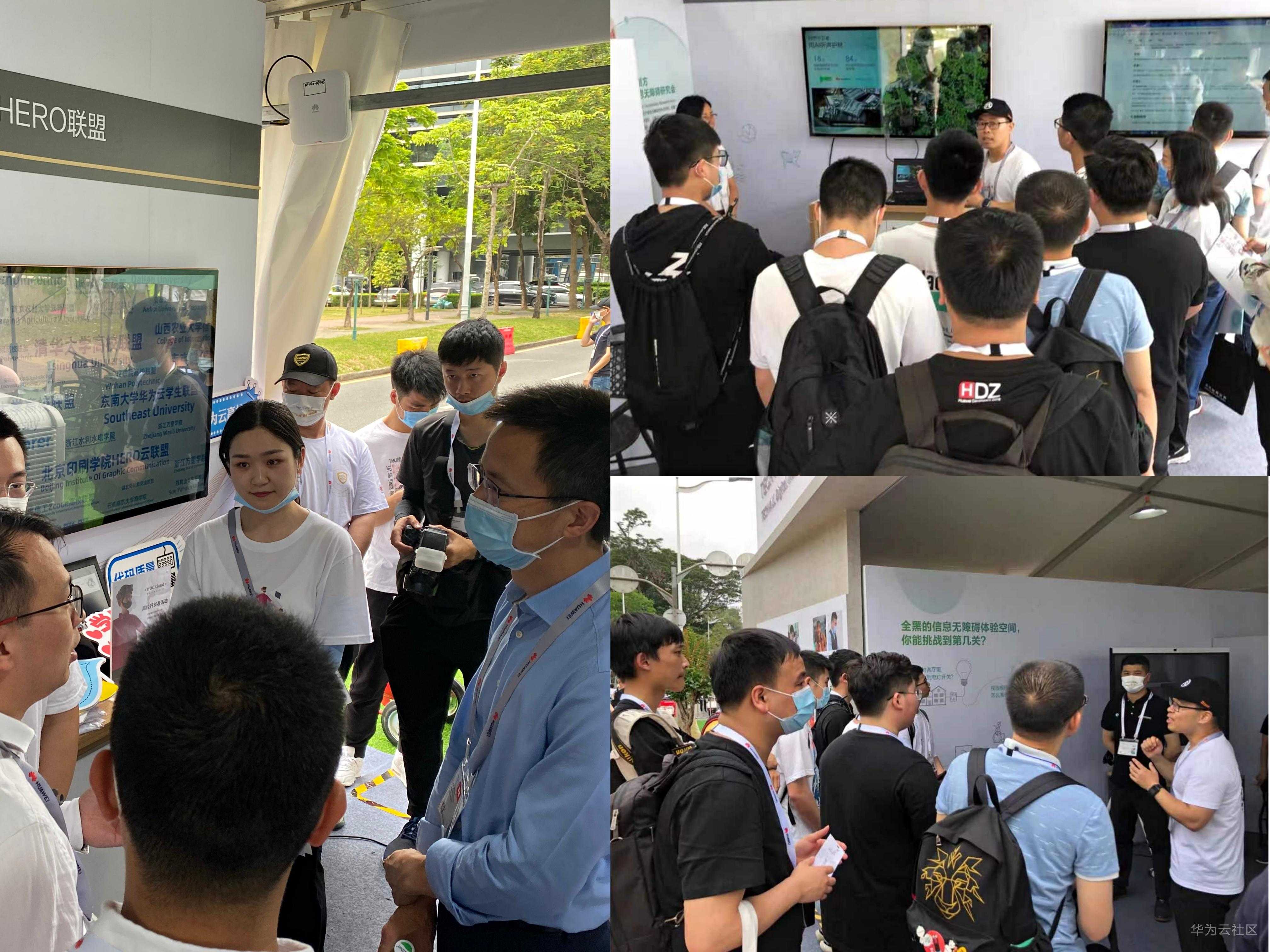 参会者在听完上午的主题演讲之后,纷纷来到华为云各展台进行技术交流。开发者展岛人头攒动,不仅有Hero联盟的各盟主们,还有华为云专家带头主动给参会者进行详细介绍。南山区的领导也前来观看,在展位前合影留念。