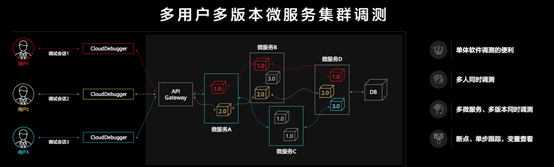 在这样一个场景下,三个用户,用户1、用户2和用户3。用户1通过CloudDebugger发起了调试会话,他的调用链条是微服务A的1.0、B的1.0和D的1.0版本,用户2的调试会话的调用链是微服务A的2.0、B的2.0和D的2.0版本。用户3是在进行微服务3.0的开发,他不关心其他微服务,所以调用链是微服务A、C和微服务D的3.0版本。在这样一个复杂的场景之下,CloudDebugger能给开发者带来什么?第一,这三个用户之间的调试会话互相独立,互不干扰;言下之意,用户1的请求不会触发其他人的断点。第二所有设置断点、单步跟踪、变量查看、调用堆栈等单体软件调试的便利性CloudDebugger都支持。