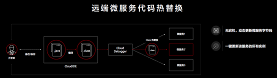 除此之外,用户在调测过程中需要不断修改代码。CloudDebugger支持代码热替换功能,每次修改的增量代码,CloudDebugger可以动态的、无宕机的一键式更新到远端微服务实例。