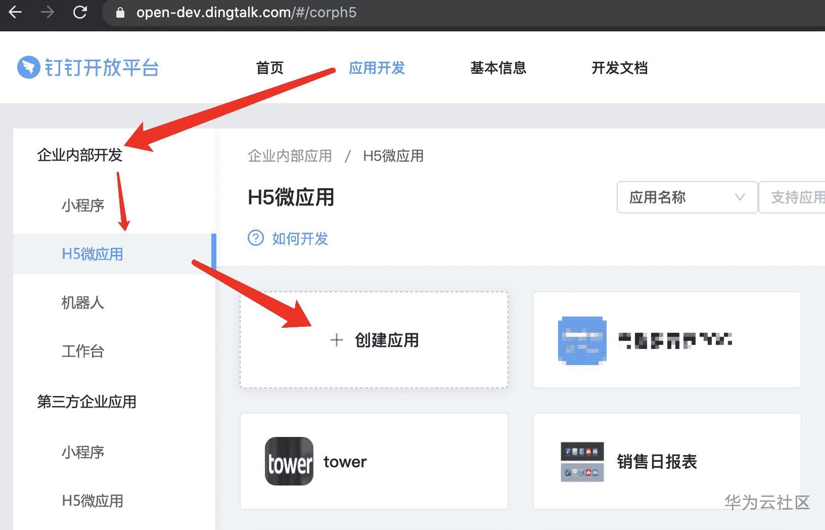 4.在应用开发页面,选择企业内部开发 > H5微应用,然后单击创建应用