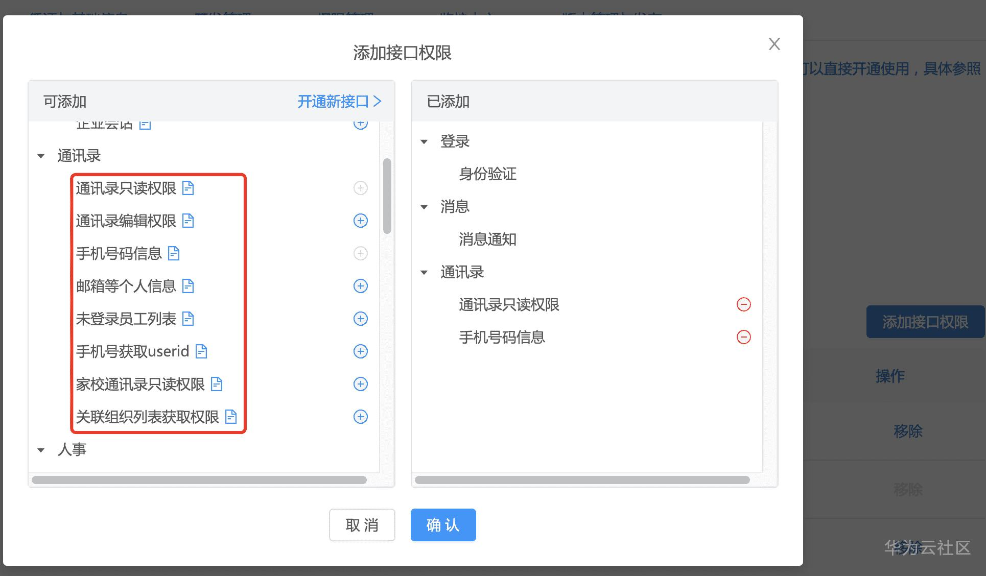 8.如果需要获取通讯录权限,就要添加合适的接口权限