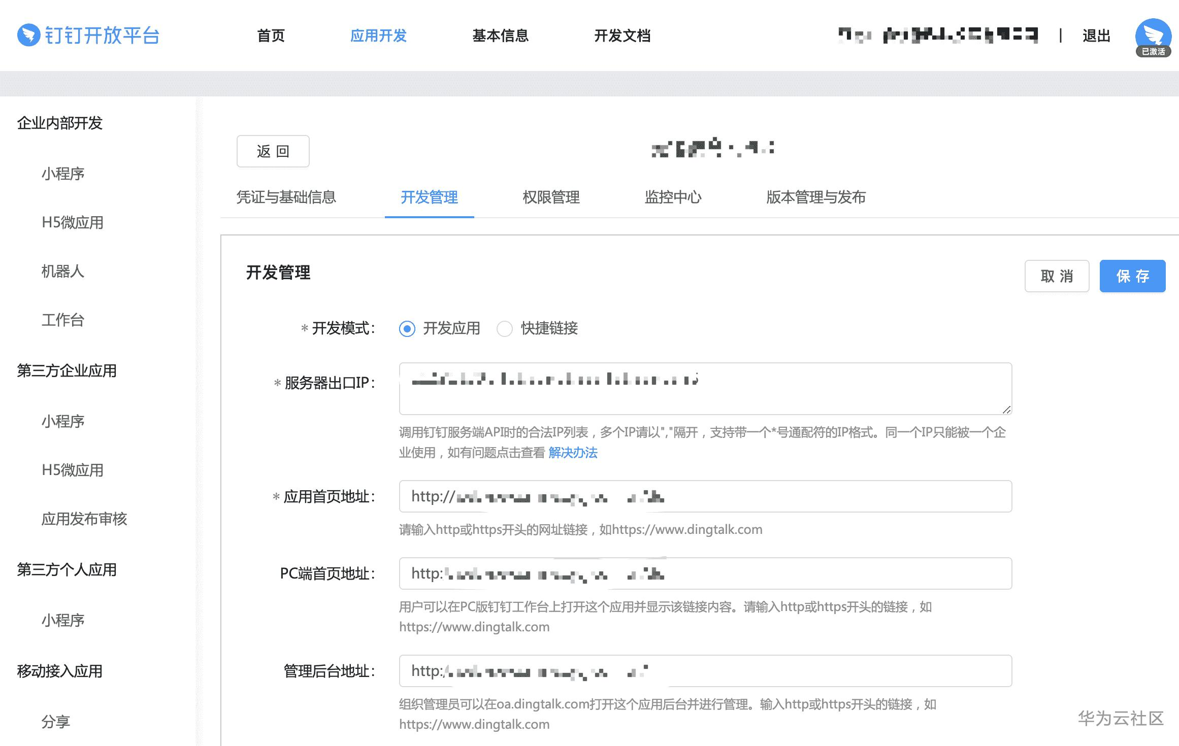6.在应用信息页面,单击开发管理,然后单击修改